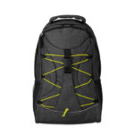 Backpack in 600D 2 tone polyester with colourful contrasting facing and glow in the dark cord on the front panel. Mesh pockets on both sides.