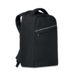 600D RPET backpack with padded shoulder strap with main internal compartment. It has a zippered front pocket. Includes one internal 13 inch laptop compartment. Zipper main compartment on backside for better security.