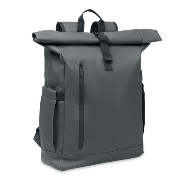 Roll top 15 inch laptop backpack in PU coated 600D RPET polyester and RPET polyester lining. Meshed padded back with zippered pocket and trolley strap. Padded shoulder strap with mesh inside finishing.