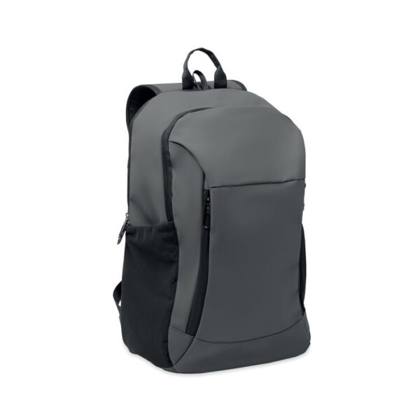 15 inch laptop backpack in soft PU with padded back and hidden zippered main compartment. 1 zippered front pocket, 2 front side zippered pockets and 2 elastic mesh side pockets. With 210D RPET lining.