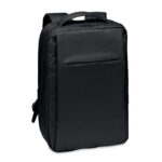 Laptop backpack in 300D RPET Polyester with padded shoulder strap including one main internal compartment for 16 inch laptop and a USB charging cable.