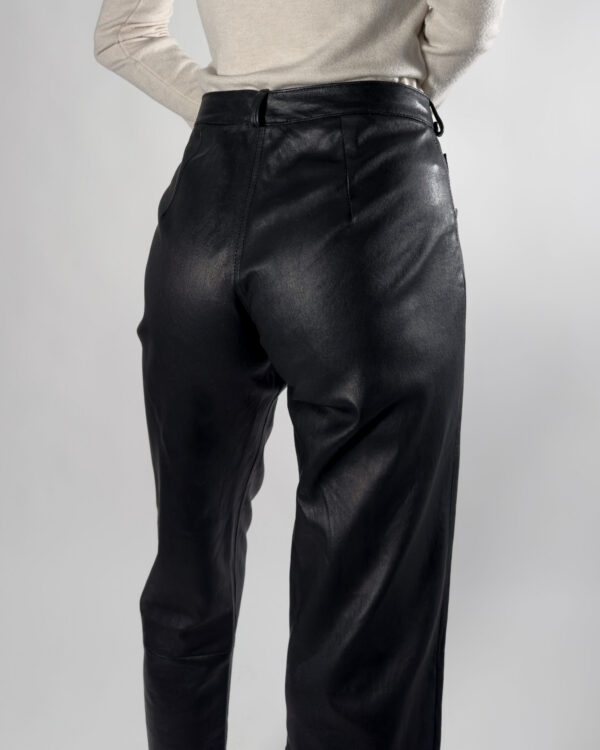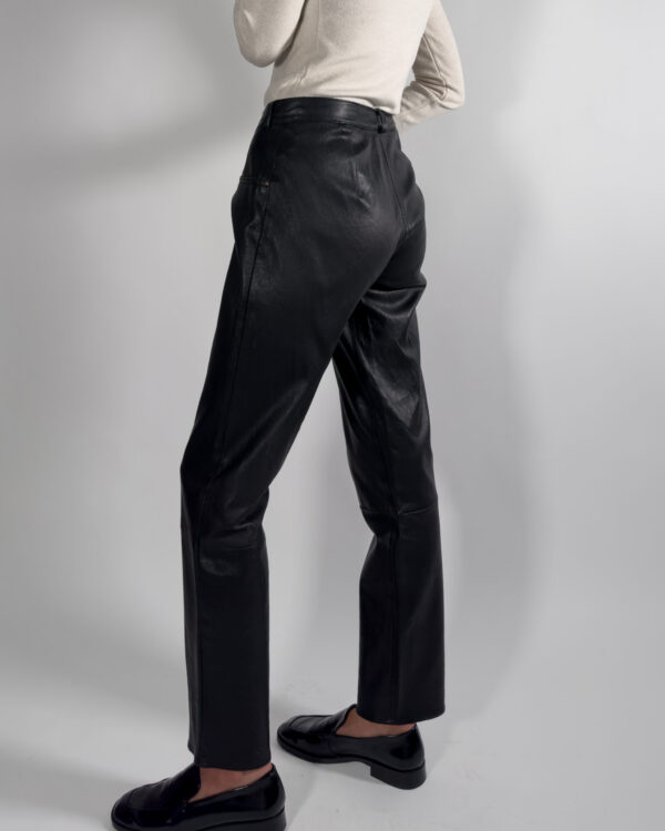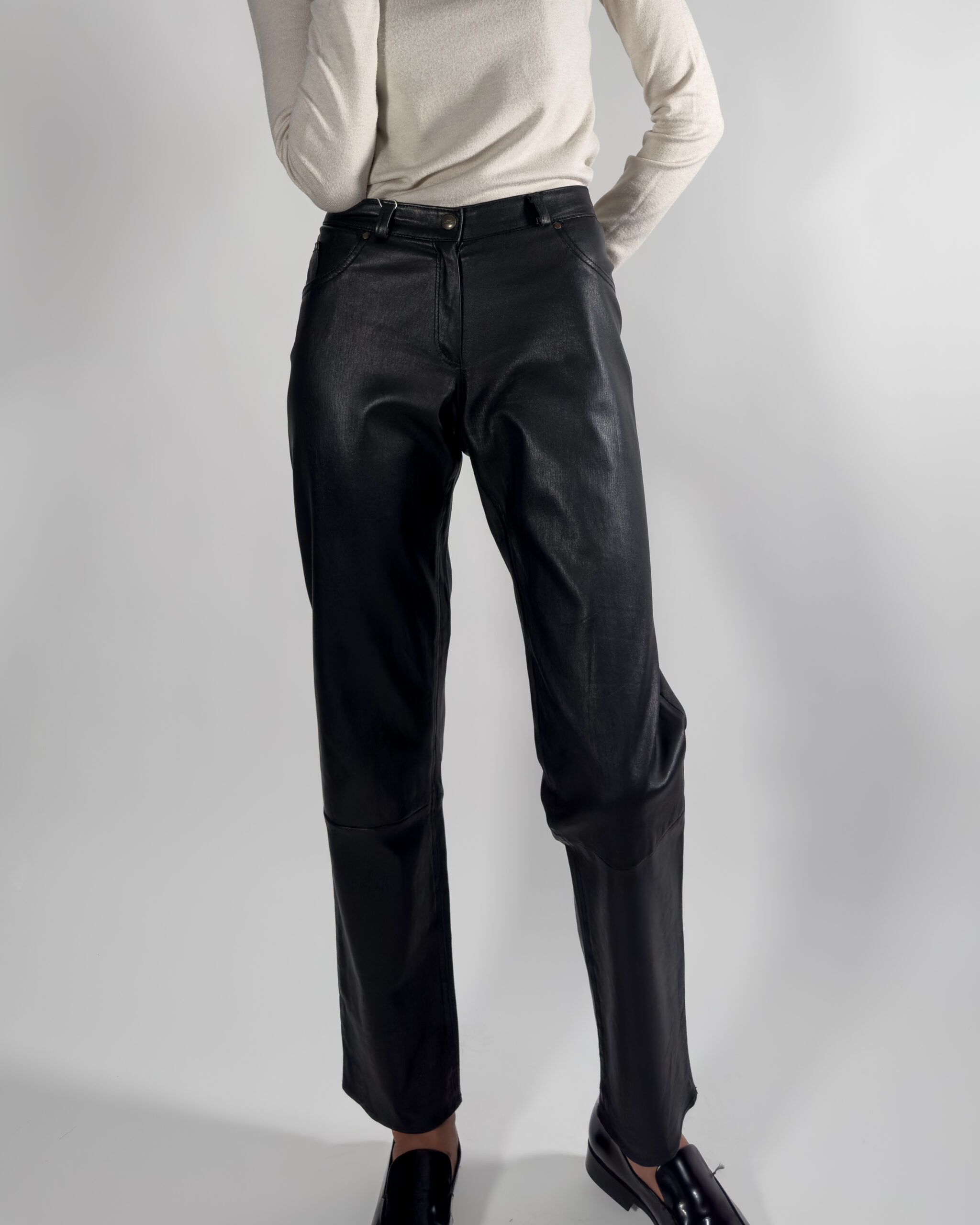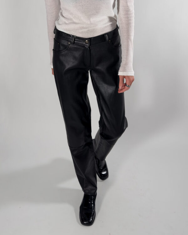 Leather trousers in classic black. Designed with zipper closure, belt holes, and functional front pockets.