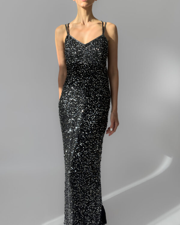 Elegant full-length gown featuring shimmering black and silver sequins throughout. Designed with a flattering double-strap neckline, back zipper closure, and a subtle back slit. The interior is fully lined in 100% pure silk, providing a luxurious feel against the skin.