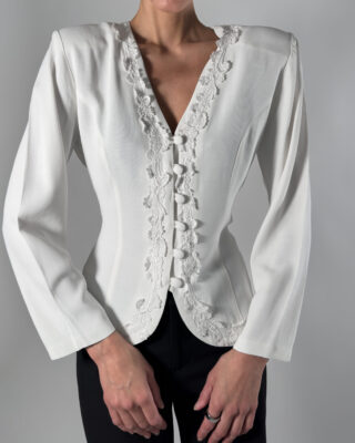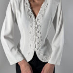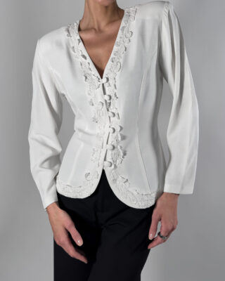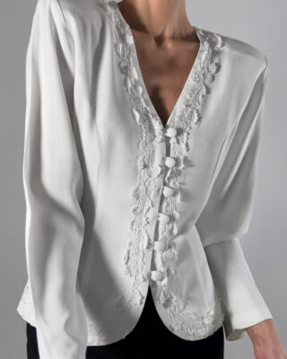 Blondie&Me blouse with timeless silhouette, Made in the USA. Featuring embroidery along the button-up front, adjustable back for a flattering fit. Soft blend of acetate and rayon, the blouse feels light and smooth against the skin.