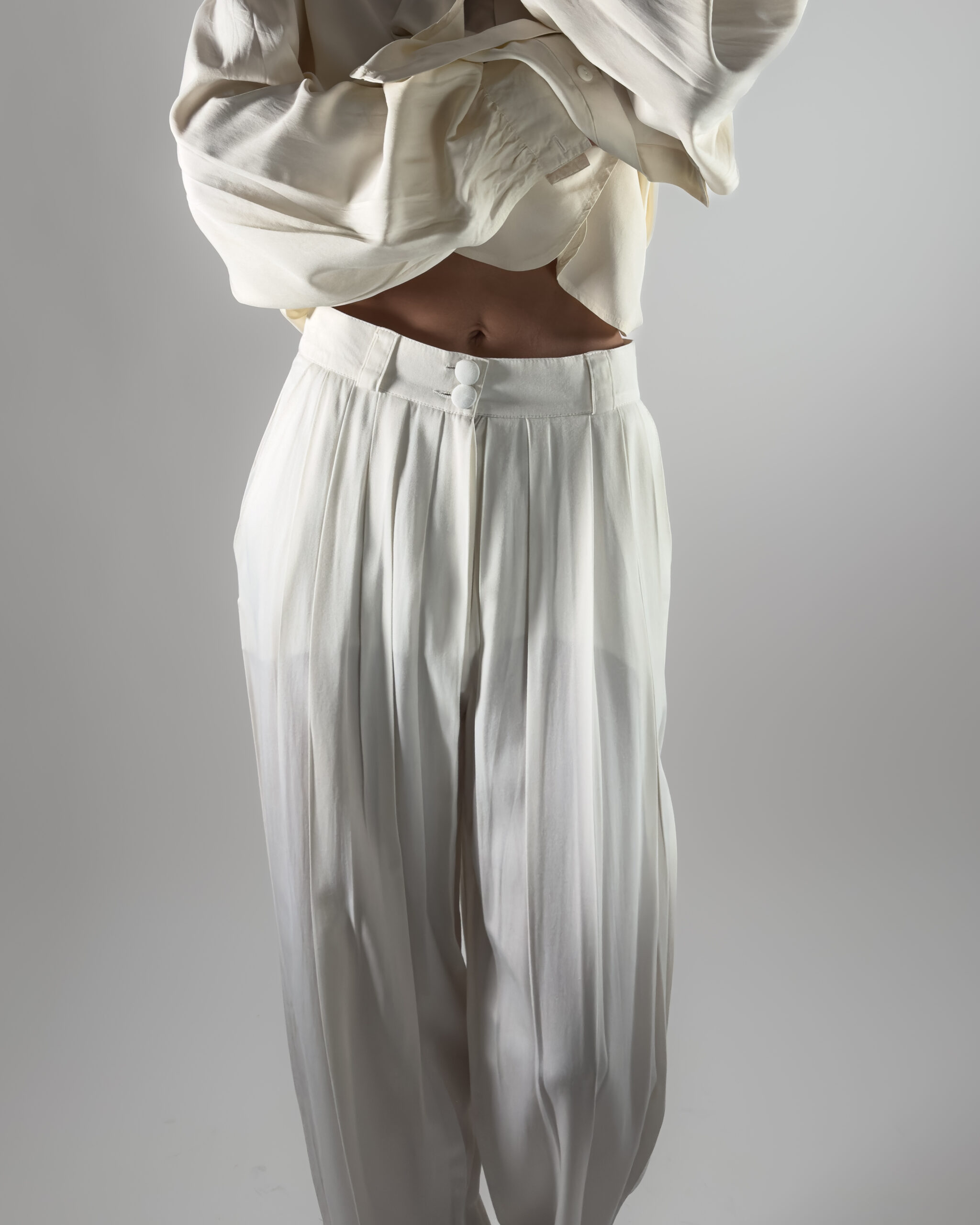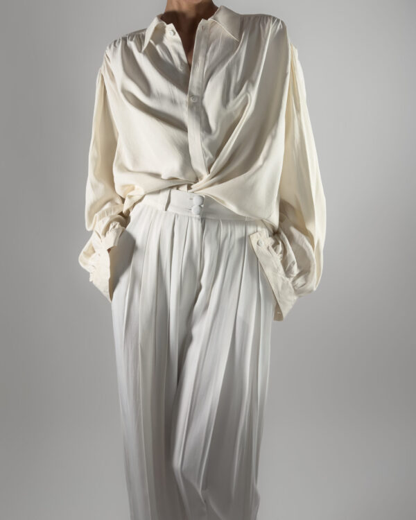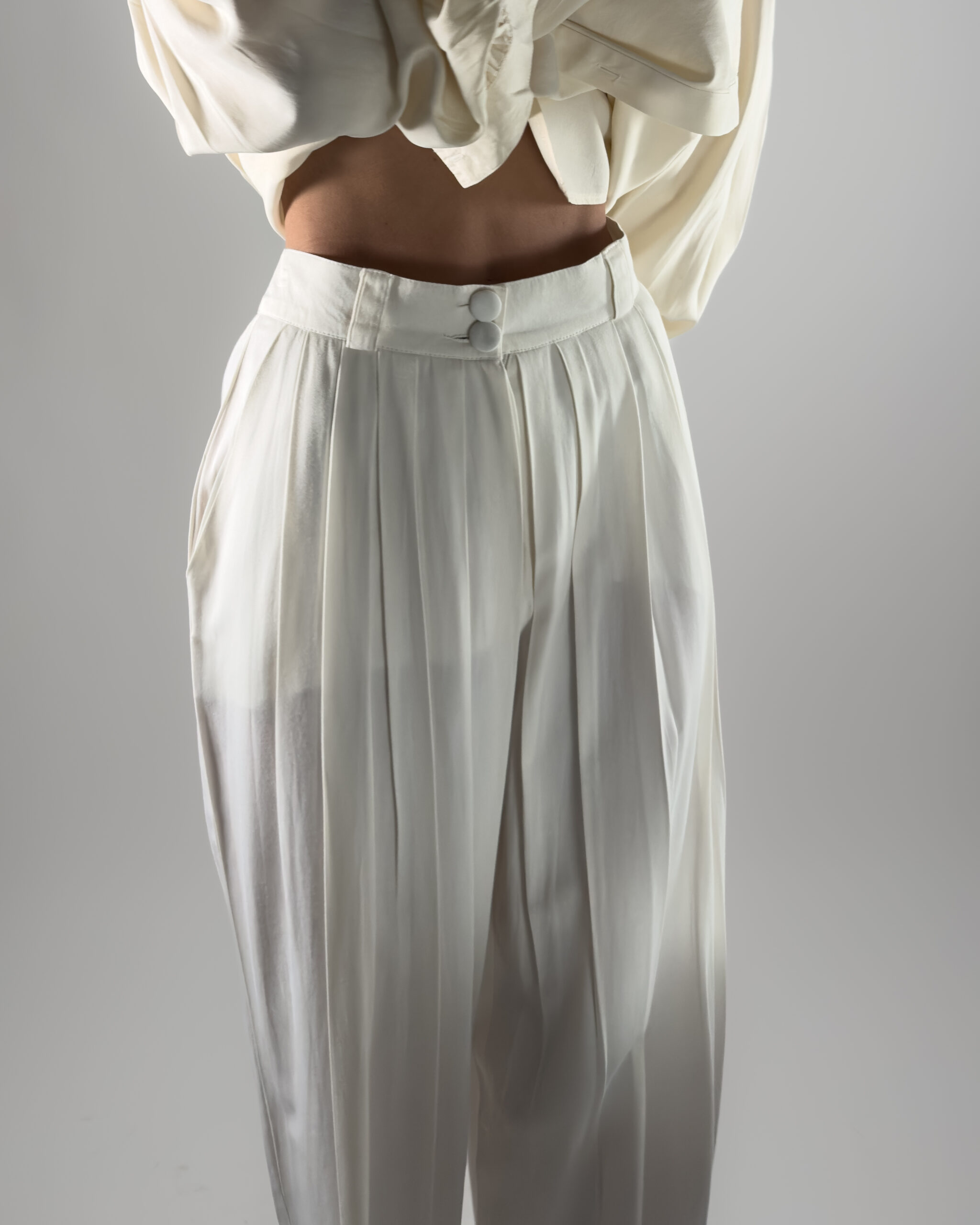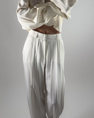 Elegant high-rise trousers in cream white. Designed with pleats, belt holes and front pockets.