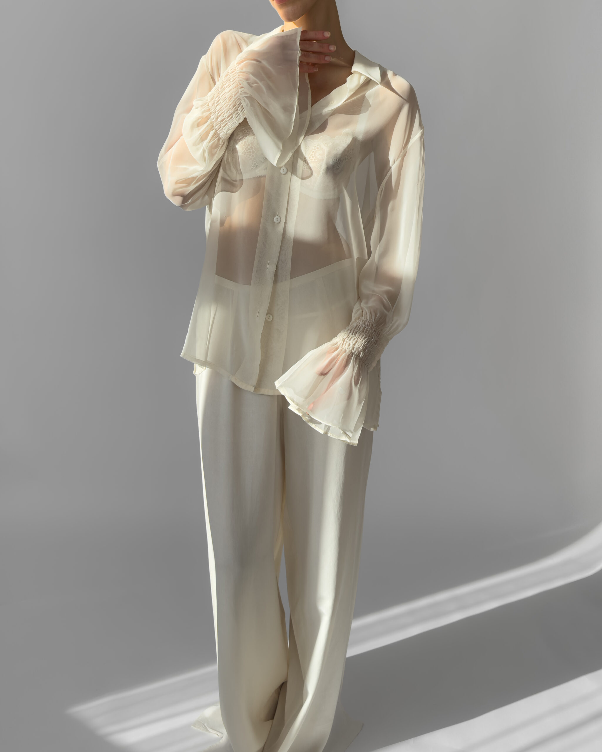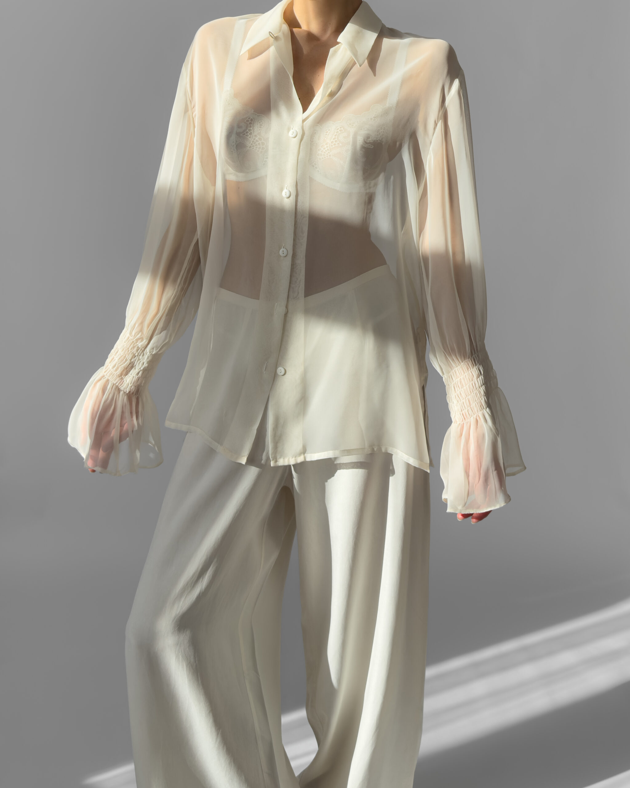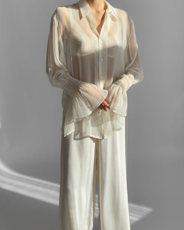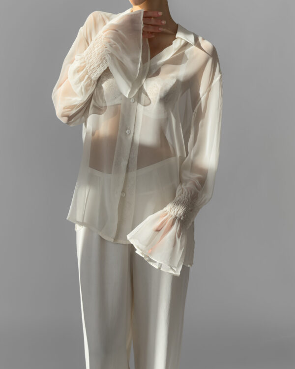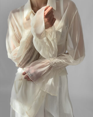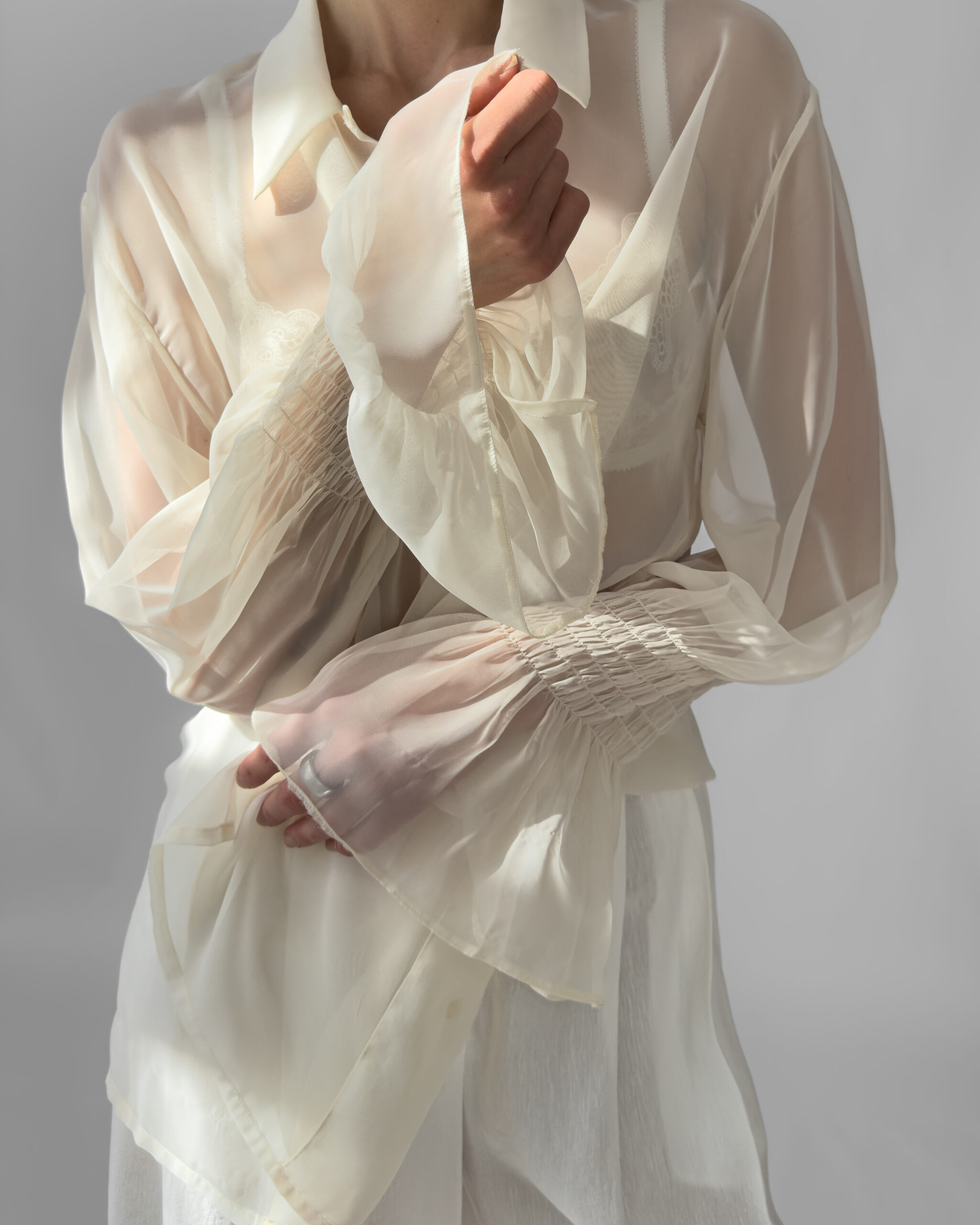 Sheer blouse in cream white by S.Oliver. Features a button-up closure, pointed collar, and long sleeves with a soft drape.