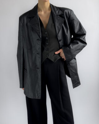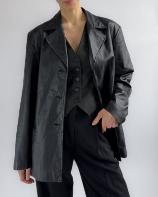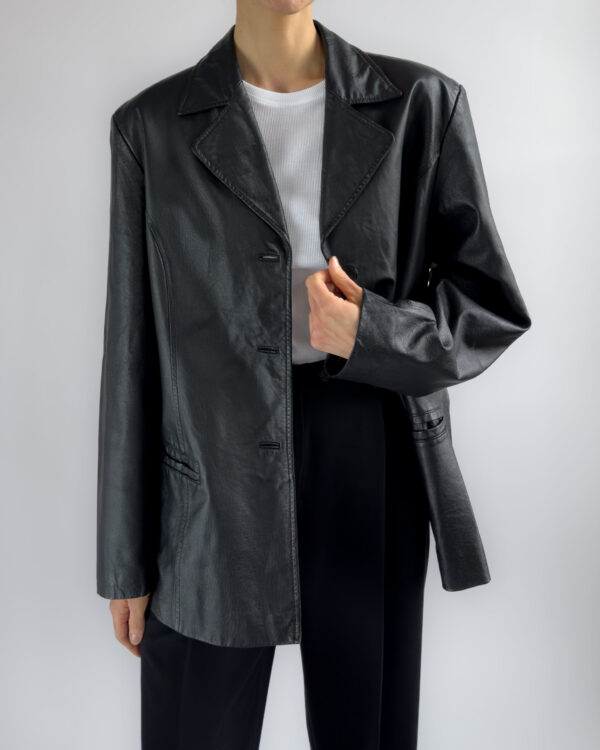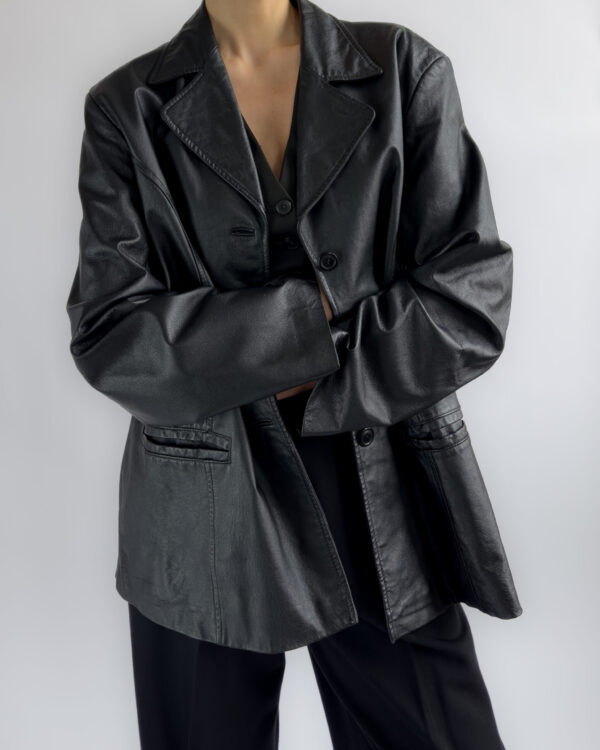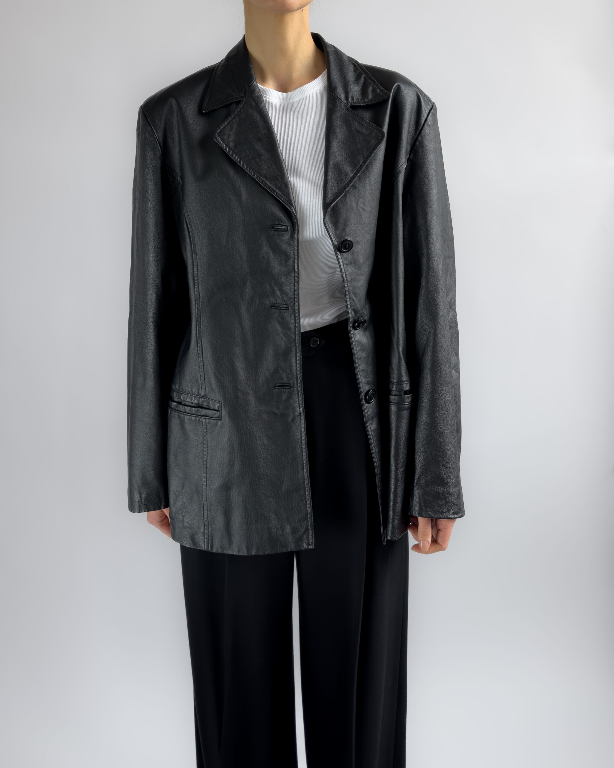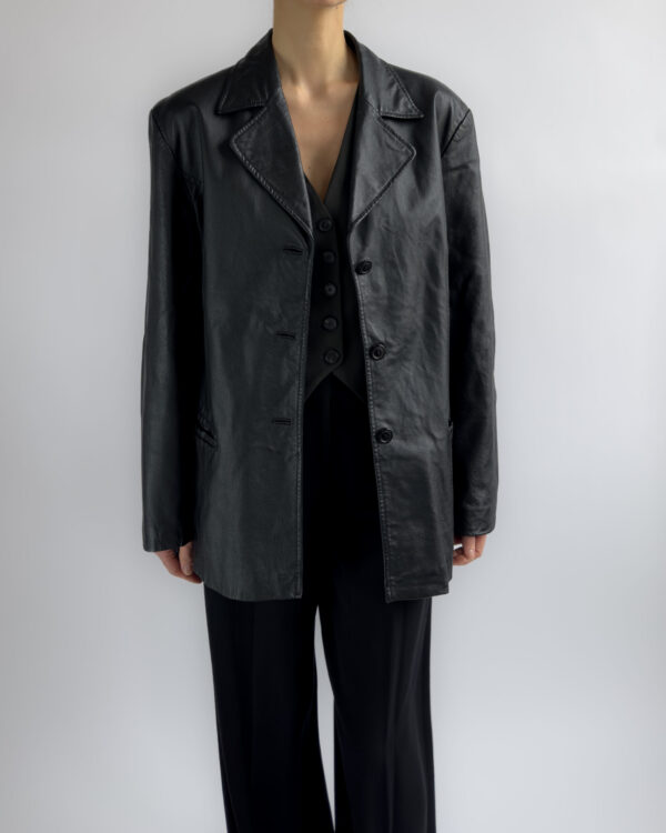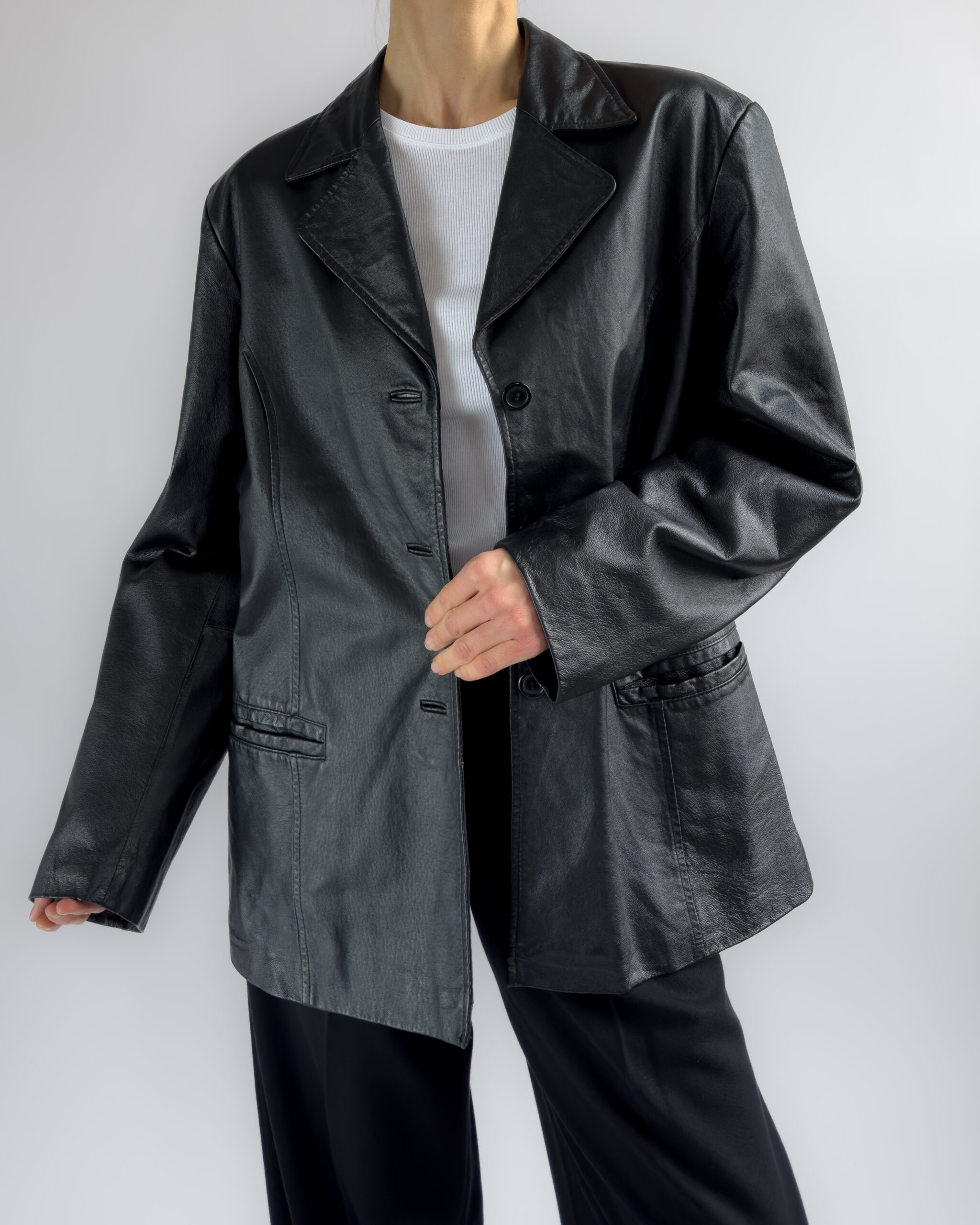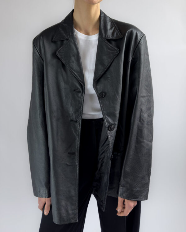 Made from genuine leather, this sleek black jacket features a sharp blazer-style silhouette with classic notched lapels and subtle structure.