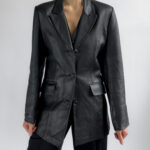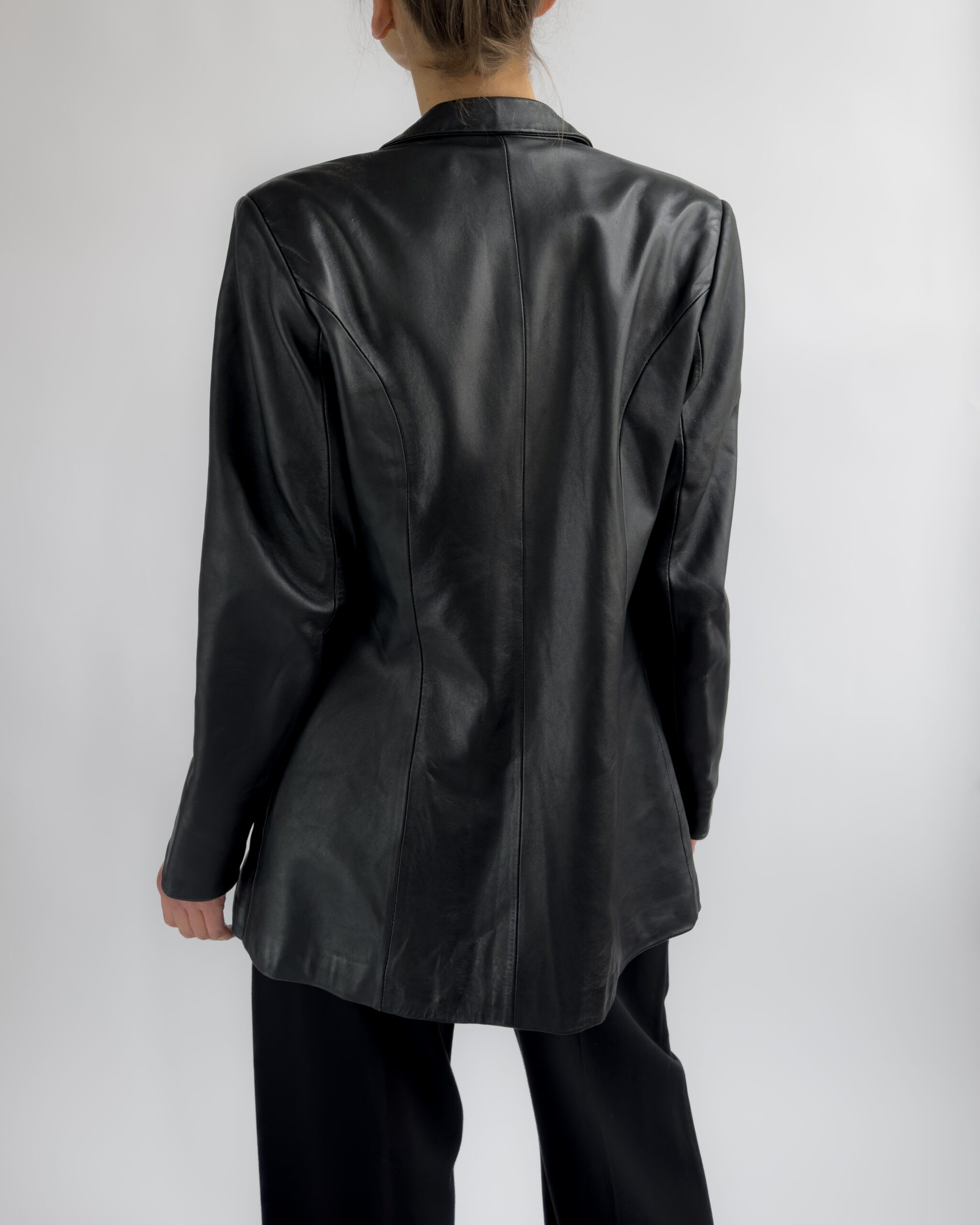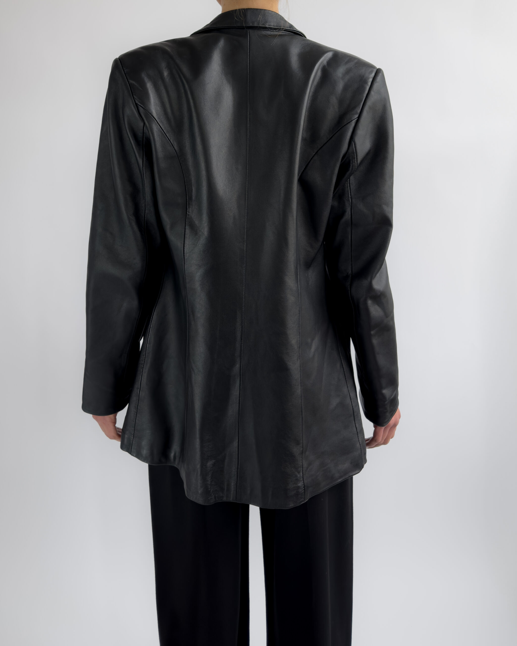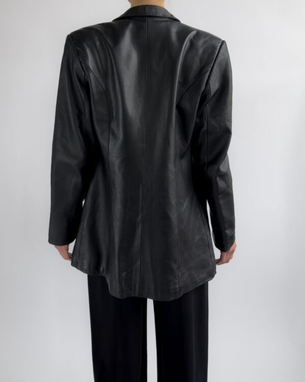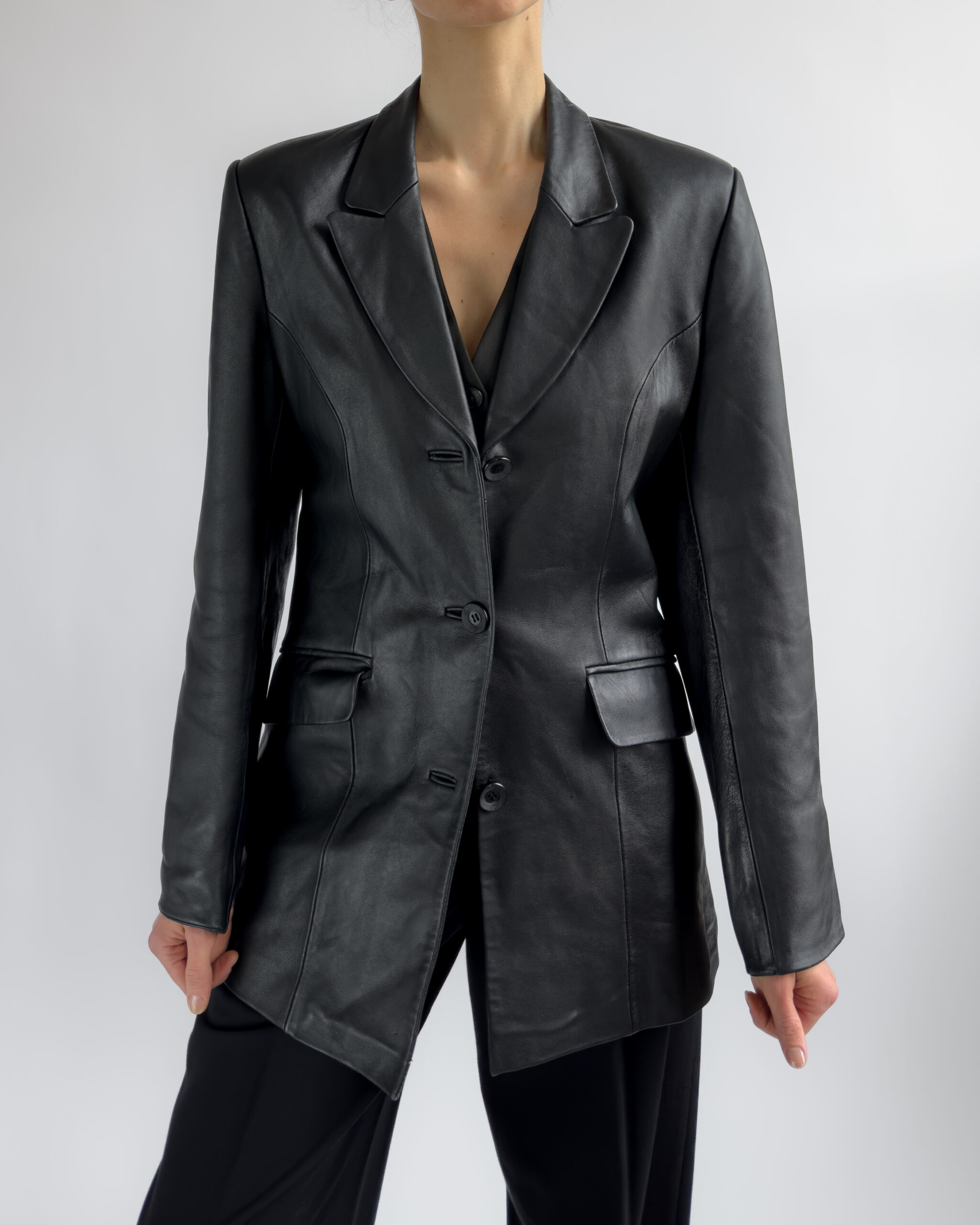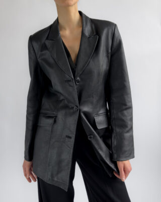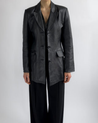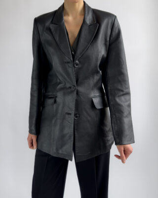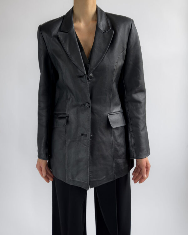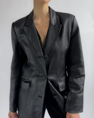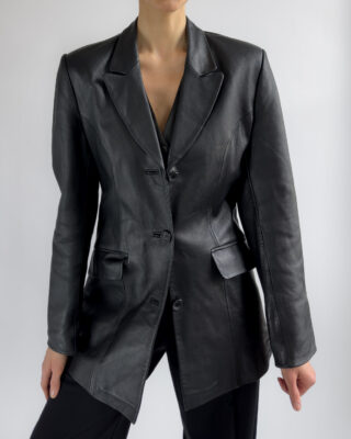 Sharply tailored black leather blazer by Kinai. Made from smooth 100% leather with a silky black lining, this piece features a flattering fitted cut with clean lines and a structured look.