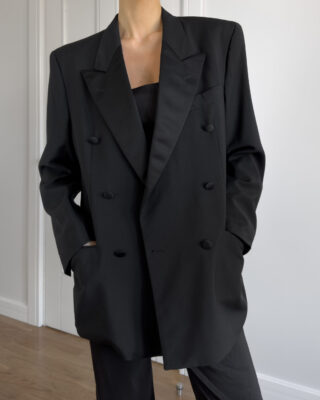 This classic trench coat features a double-breasted front with structured shoulders and wide notched lapels.